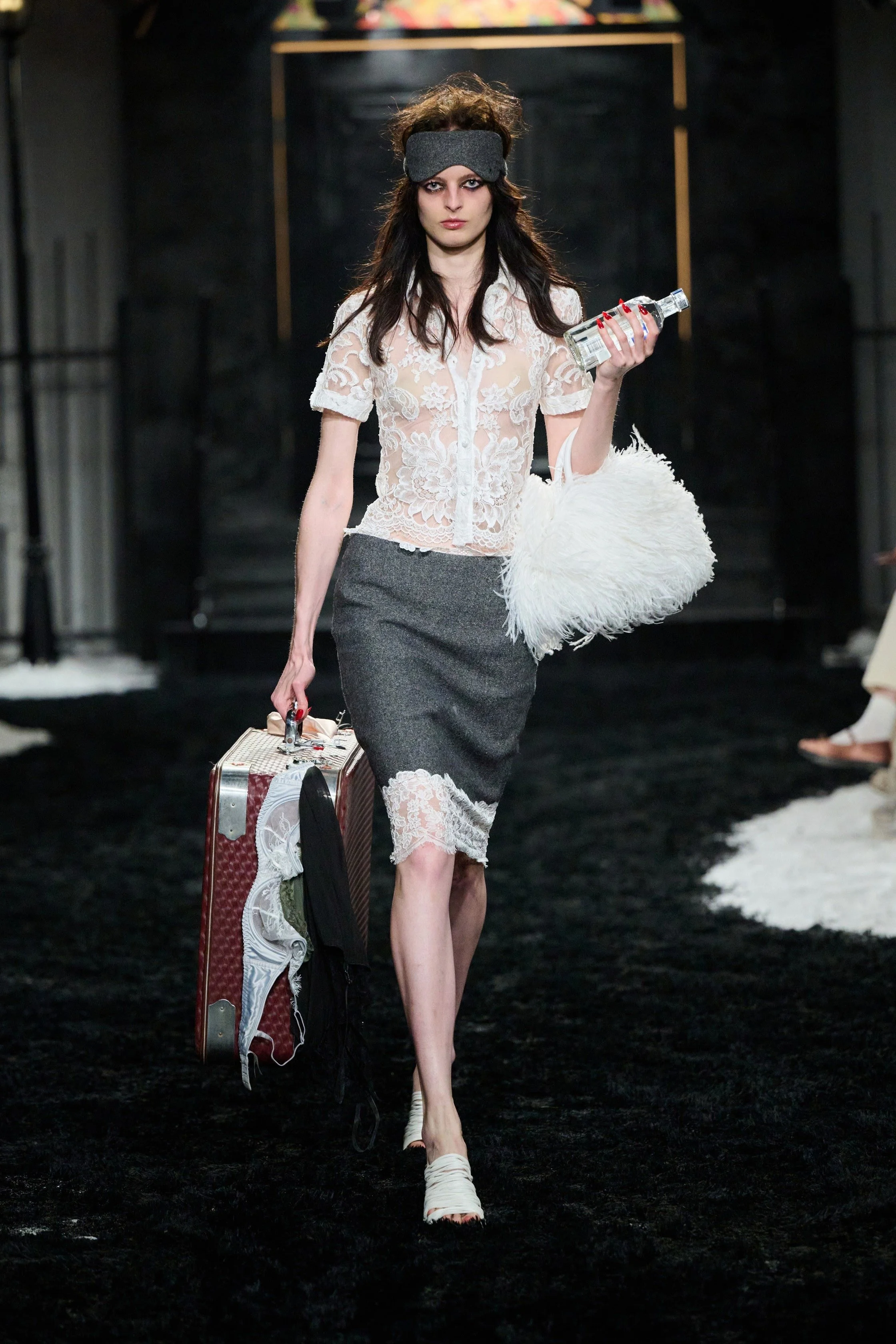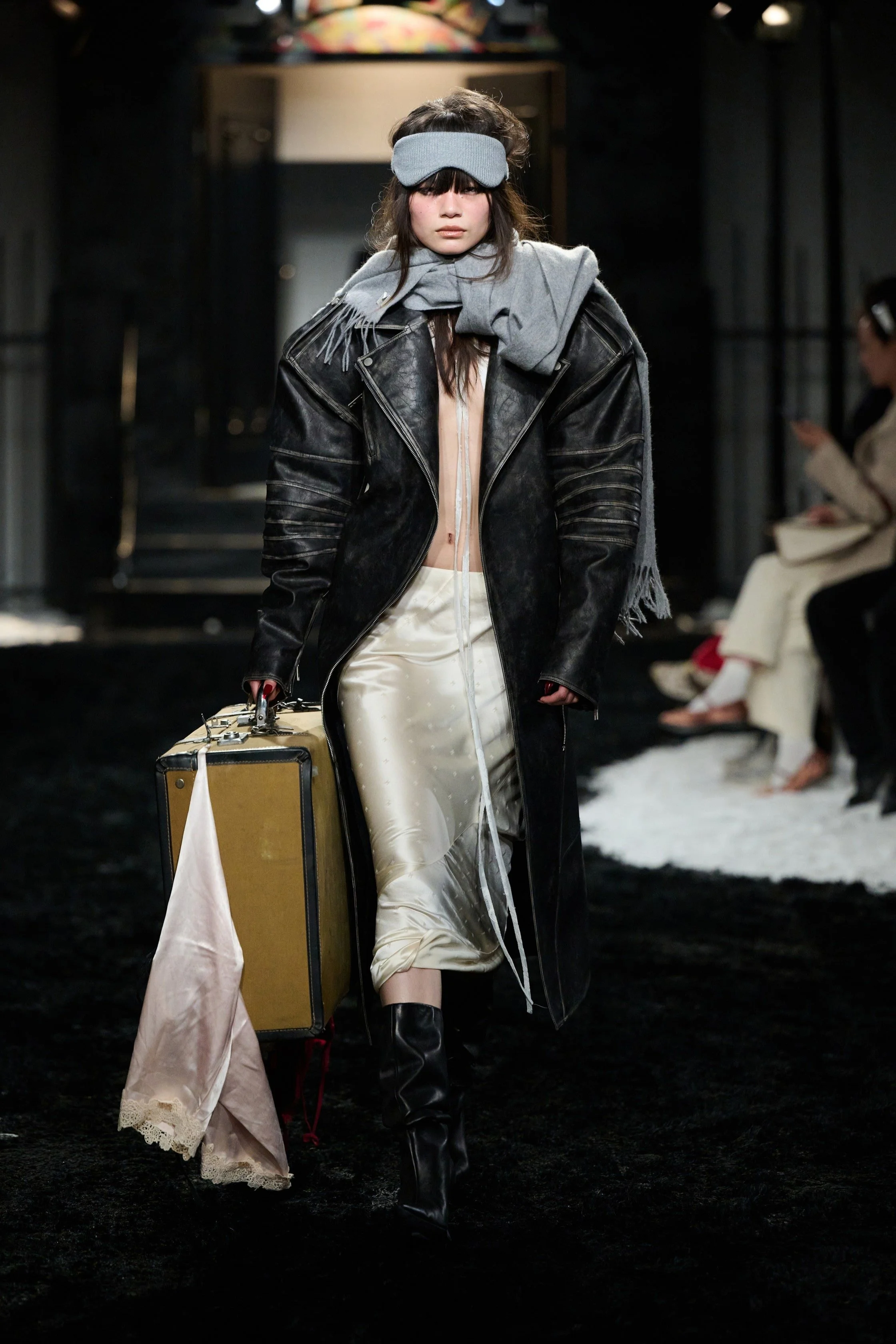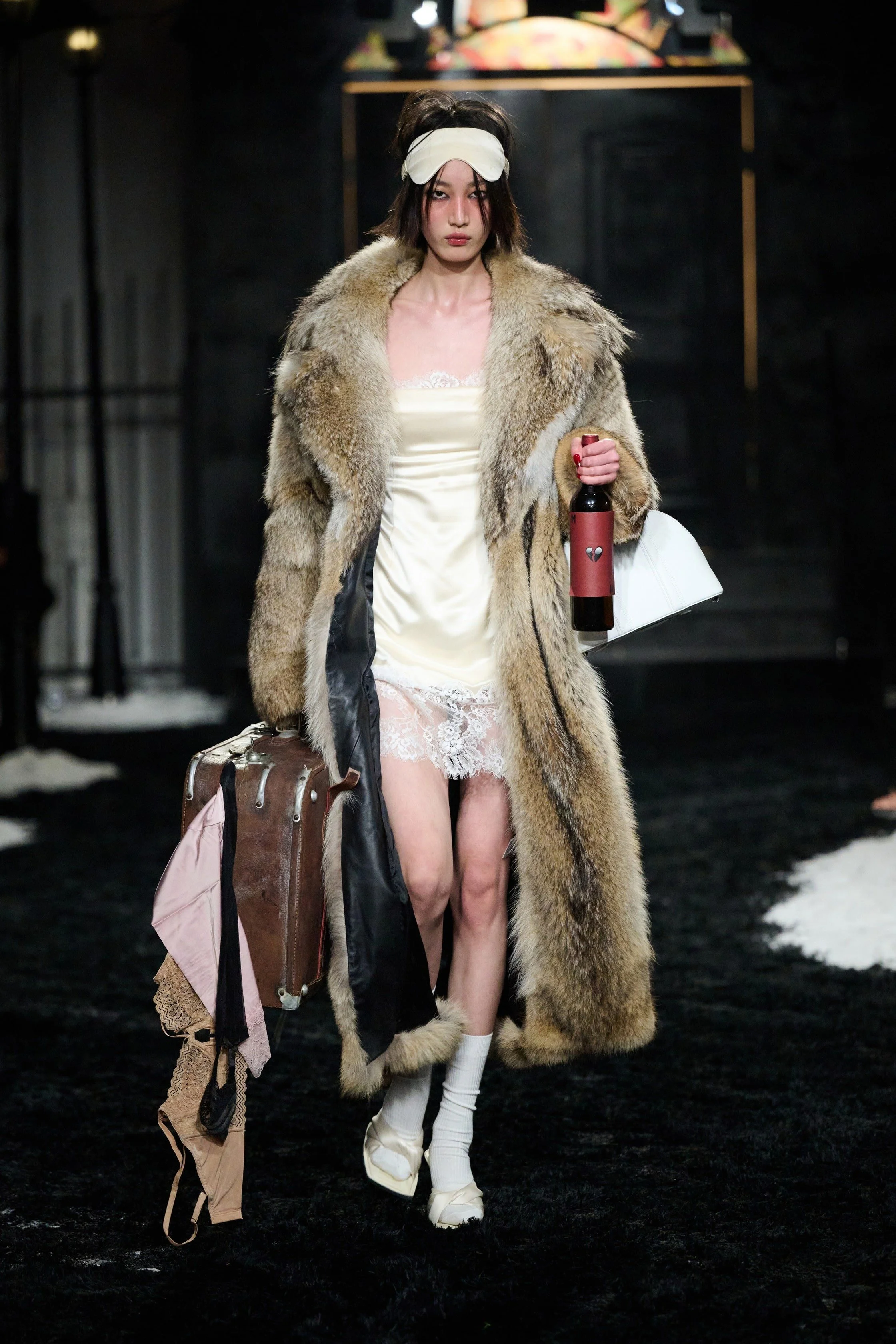 Enter the models: dubbed the ‘Heartbreak Club’ collection, they sported pyjamas, silk dresses, and fur coats alongside Gong’s signature cargo, denim suits, and mini dresses. Looks were styled to reminisce iconic outfits worn by Carrie Bradshaw, such as the plump fur coats draped over silk gowns throughout the series. The garments were made with primarily straight, oversized silhouettes that strategically revealed the model’s skin. An aura of recklessness was not only expressed through the clothes but also theatrically, as models walked as if they were drunk, falling and stumbling down the stairs — highlighting Gong’s notion of “wearing yourself out”.