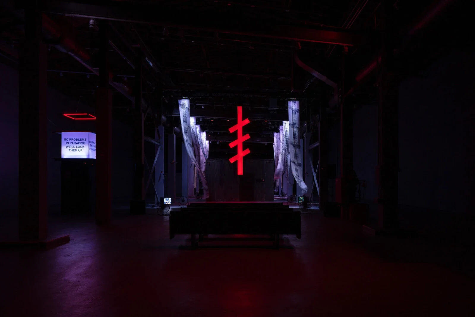 Upon entering her mock prison cell, Nadya Tolokonnikova let out a guttural shriek. Her voice reverberated through the installation, layered with eerie lullabies, climaxing into harsh bursts of noise. Occupying the central cell, Tolokonnikova was dimly lit by neon light, adorned in a forest green Adidas jumpsuit. Visitors were prompted to inspect and surveil the scene. Bed sheets made by American and Belarusian prisoners lined the walls, as the space came under each character's gaze. The performance, Police State (2025), bore a tension between prison and sanctuary.