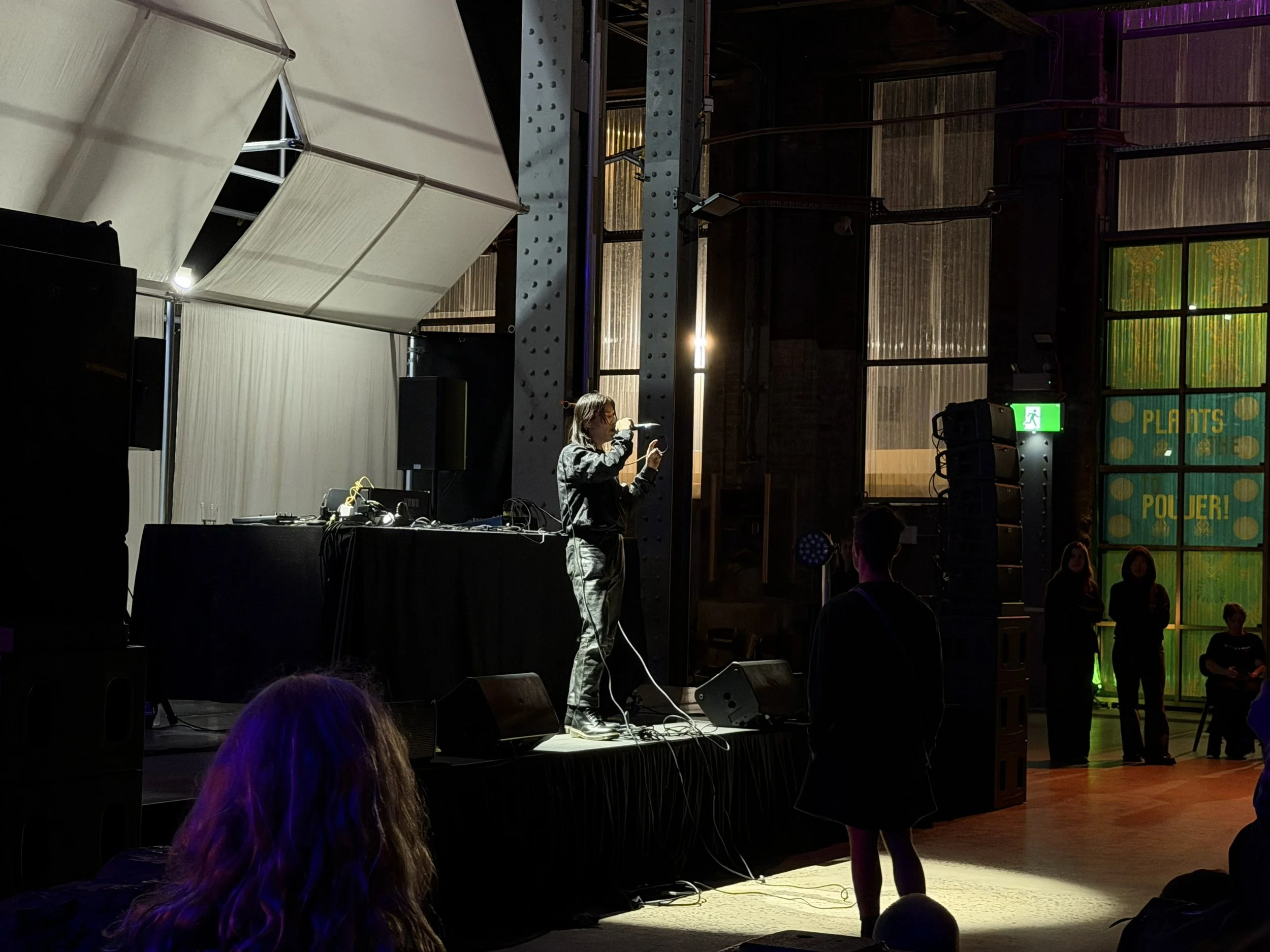 After the performance, Jungist, an Eora-based DJ known for her experimental music, features on FBI Radio and co-founding of Decay Audio, performed, complementing the atmosphere of the White Bay Power station. Jungist also created a smooth transition between Marcus Whale and Ruhail Qaiser’s performances whilst people took the time to wander through the art installations and take them in. It was great to see collaboration between Liquid Architecture and the Sydney Biennale and for the set to include prominent Eora-based artists and contributors to FBI Radio.