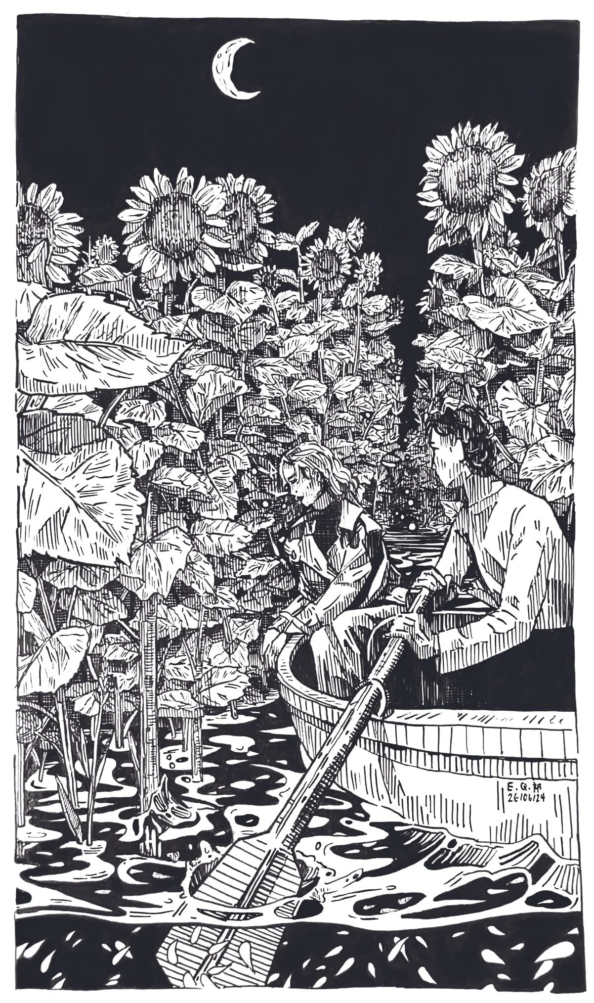These artworks depict a sense of catharsis in confronting chaos. Up close, there is a rigidity to the artworks - vertical parallel hatching in ranging thicknesses provide structure and order. Yet, when viewed from afar, high contrast areas detract from the focal point, drawing attention to the haphazard arrangement of composition. The drawings allow for a representation of turmoil within a controlled, imaginary space. There is a visual dissonance in this piece; amongst the pandemonium lies quiet order.
